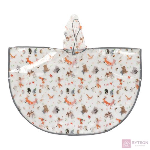 Átlátszó gyerek poncsó, erdei állatos mintával. Garantált a jó hangulat akkor is, ha esősre fordul az időjárás! A vidám mintával díszített poncsó kényelmes méretezése miatt több szezonban is elkíséri majd kis gazdáját, vastagabb és lazább öltözékre felvéve is garantálja a komfortos viseletet és a mozgékonyságot - ellentétben a szűkebb esőkabátokkal! Az esővédő poncsó fényvisszaverős szegélye sötétben is gondoskodik a láthatóságról, a rókák, őzikék, a kis sünök, a borz és a többi kedves kis állat egészen biztos mosolyt fog csalni a legkisebbek arcára is!