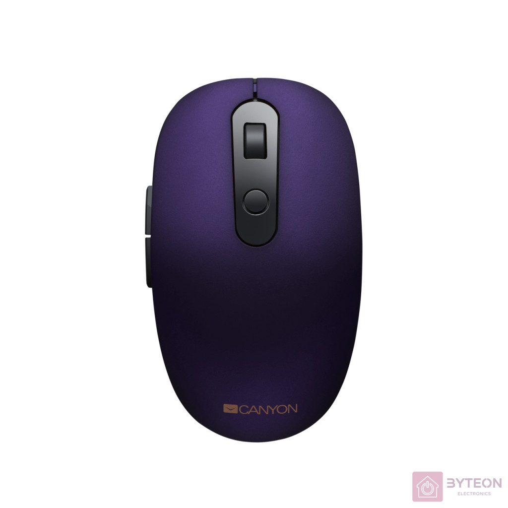Megj.: Canyon 2 in 1 Wireless optical mouse with 6 buttons, DPI 800/1000/1200/1500, 2 mode(BT/ 2.4GHz), Battery AA*1pcs, Violet, silent switch for right/left keys, 65.4*112.25*32.3mm, 0.092kg