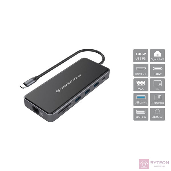 - 12-in-1 USB-C to HDMI/VGA/USB-C PD/USB-C data/USB 3.0/USB 2.0/SD/TF/GbE/AUX multiport adapter