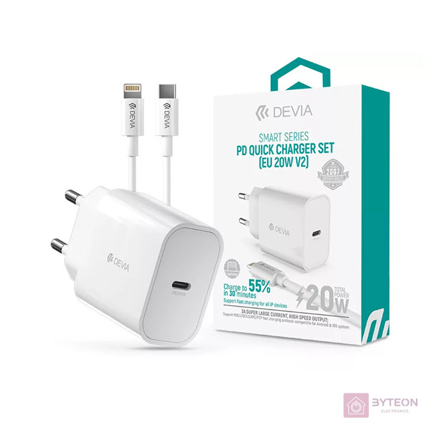Devia ST383847 20W Type-C PD fehér hálózati töltő adapter + 1m Type-C - Lightning kábel
