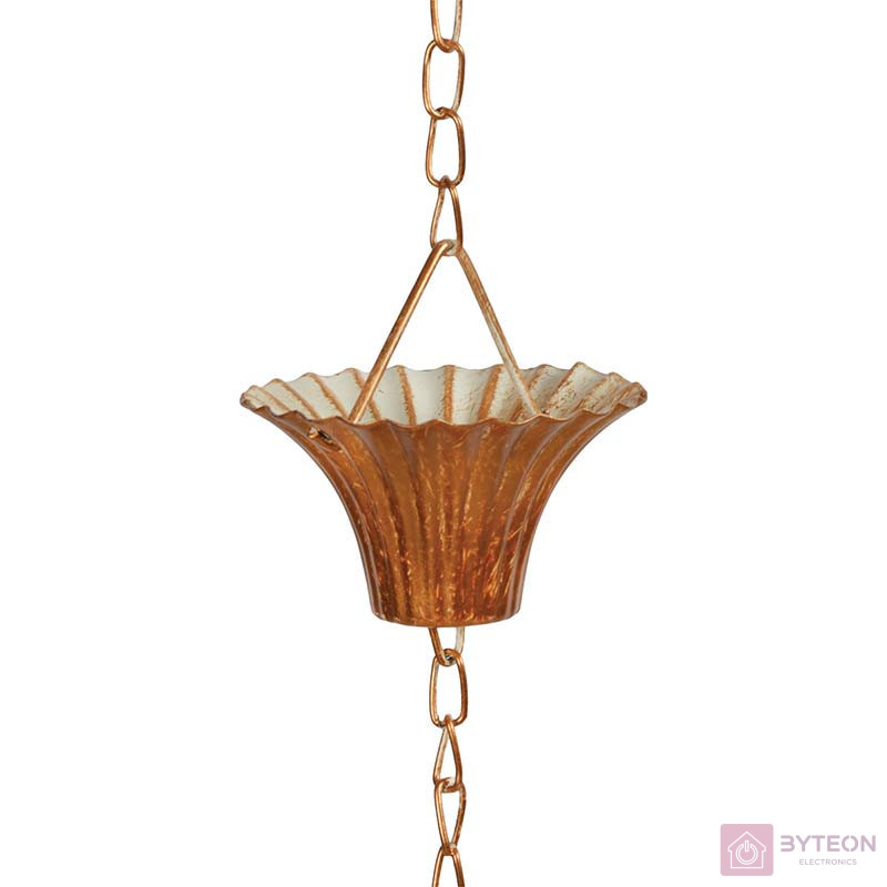 Rézbevonatú vízelvezető lánc, amely a zárt lefolyócsövet helyettesítheti. Esztétikus látványt nyújt és pompásan illik a legkülönbözőbb stílusú épületekhez is. A csordogáló víz először megtölti a kis kelyheket, majd továbbgurul a talaj felé. Tehetünk alá hordót vagy dézsát is és az összegyűlt esővizet felhasználhatjuk a virágok öntözésére.