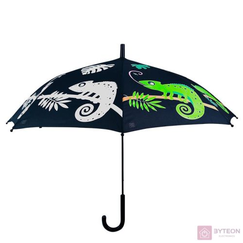 Különleges esernyő kaméleonos díszítéssel. Egyediségét színváltós tulajdonsága adja, mivel napos időben a minta fehéren marad, míg eső közben használatkor színesre vált. Ajánljuk azoknak, akik egy igazán különleges darabra vágynak. Kisebb méretéből adódóan a gyerekeknek is könnyen használható lesz.