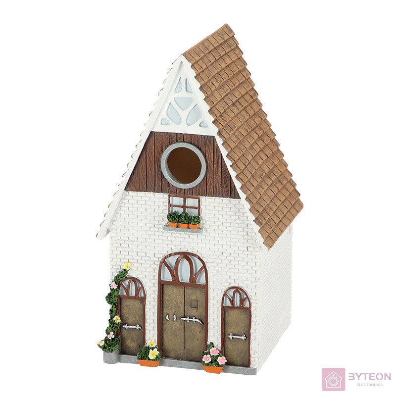 Farmház kinézetű, dekoratív madárház. A műgyantából készült, skandináv ill. német stílusú házikó ellenáll az időjárás viszontagságainak, szélnek és esőnek. Kiváló menedéket és fészkelési helyet biztosít a cinkéknek a kertben vagy az eresz alatt. A 27 mm átmérőjű nyílás ideális a legtöbb cinegeféle számára, így vendégül láthatod a széncinegéket, a kormosfejű cinegéket, a kékcinegéket és a búboscinegéket is. A ferde tető alatti kis lyukakon szabadon áramlik a levegő, ezért nem melegszik fel az odú belseje nyáron sem. A madárház alja levehető, így ha épp nincs lakója a madárháznak, egyszerűen tisztíthatod. Az előfúrt hátoldalnak köszönhetően pillanatok alatt rögzítheted egy fára vagy akár a házfalra is. Teremts otthonos hangulatot szárnyas barátaidnak is ezzel a dekoratív kiegészítővel, mely garantáltan a kert dísze lesz!