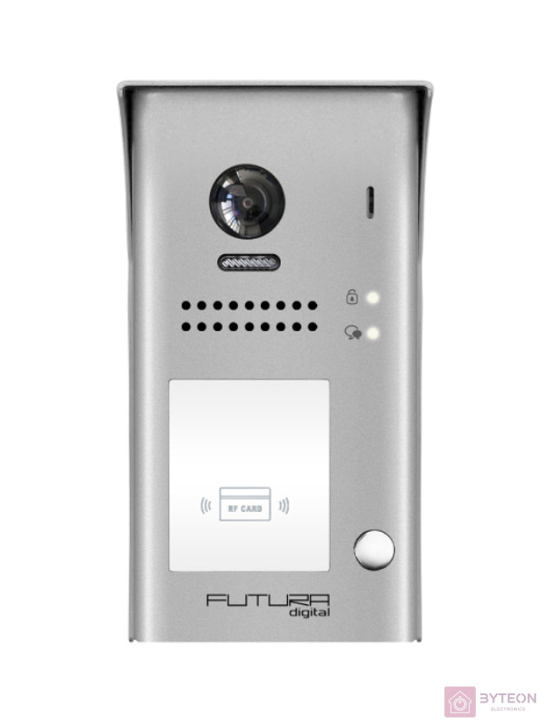 FUTURA digital színes videó kaputelefon kamera egység, 2.0 MP 1/27 halszem kamera, 1 hívó gomb, 170?-os látószög, beépített proximity kártyaolvasóval, külső mozgásérzékelő csatlakozás, 24 Vdc tápfeszültség,1 db zárnyitás kimenet 12Vdc/280mA, külső tápegység esetén zárnyitás kimenet max. 24Vdc/1A, IP 54 védelem, méret