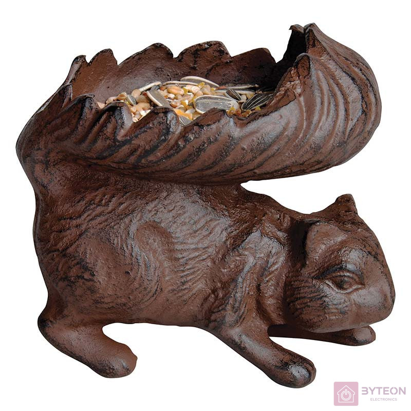 Mókus alakú, öntöttvas madáretető. Egy kis eleséggel megtöltve, pillanatok alatt kertünkbe vonzza a szebbnél szebb, hálás madarakat. Elhelyezhetjük az erkélyen is, ha egy kis természetközeli madárcsicsergésre vágyunk. Önmagában is kiváló, kültéri dekoráció. A termék az eleséget nem tartalmazza. Ajánljuk hozzá tápanyagokban gazdag FB806 cikkszámú madáreleségünket.