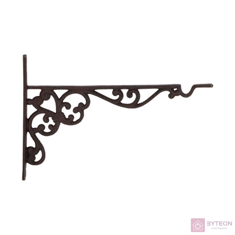 Nagyméretű öntöttvas, rusztikus hangulatú fali konzol klasszikus mintával, amelyre pompás virágainkat, lámpásainkat vagy madáretetőt is felakaszthatunk. Antik barna színben kapható, a falra könnyen felszerelhető. Dekoráljuk vele az erkélyünk vagy a terasz falát. Öntöttvas jellegéből adódóan külső elhelyezés esetén, a korrózió megjelenésével egy patinásabb, rusztikusabb termék válik belőle. TIPP: A felszereléshez szükséged lesz az ehhez megfelelő kiképzésű csavarra is. A termék a csavart nem tartalmazza.